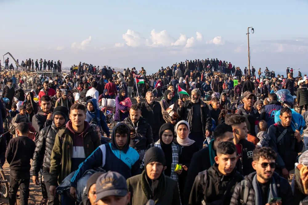 Palestyńczycy powracający do północnej części Strefy Gazy po tym, jak Izrael pozwolił im przekroczyć korytarz Netzarim 27 stycznia.