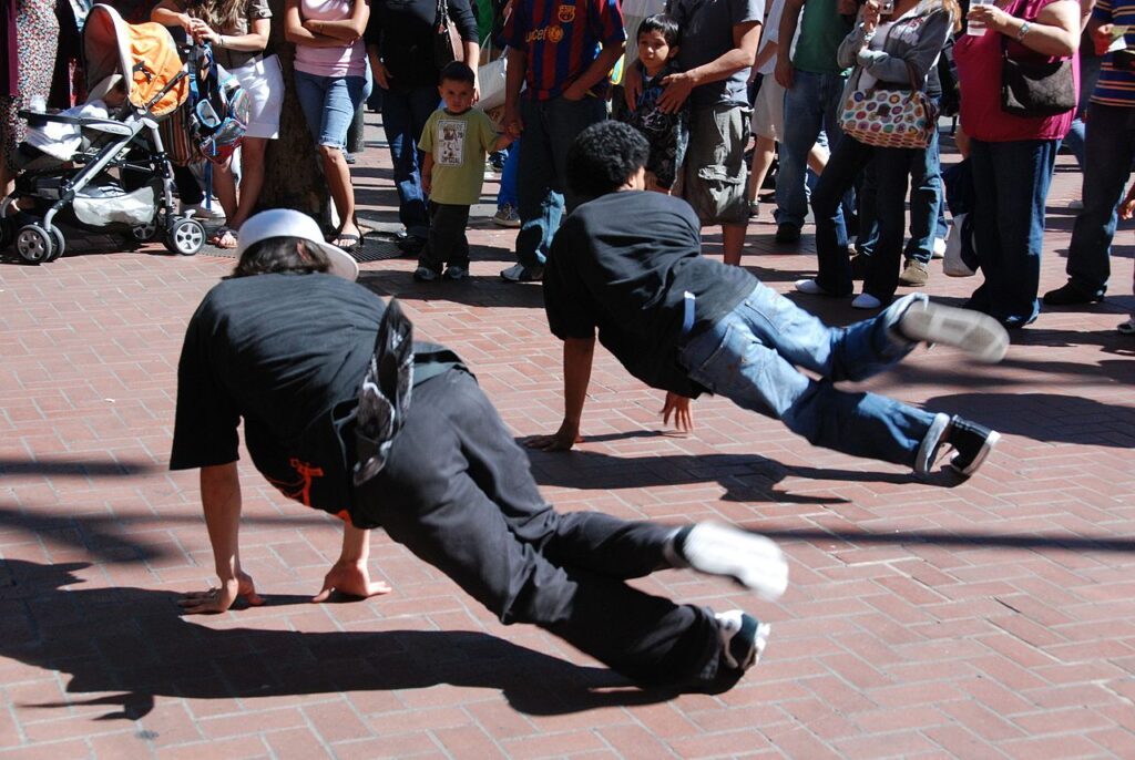 Obraz wyróżniający: B-boys występujący na Powell Street w San Francisco w 2008 roku. By Cam Vilay – Author, CC BY 3.0, https://commons.wikimedia.org/w/index.php?curid=7459446