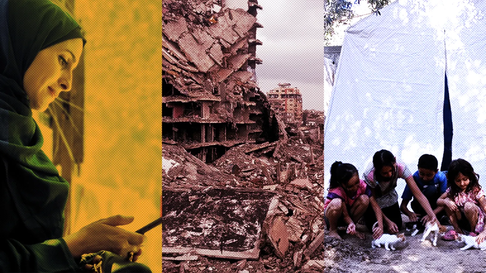 Od lewej do prawej: autorka Rasha Abou Jalal, gruzy jej dzielnicy w mieście Gaza i dzieci Rashy bawiące się przed swoim zniszczonym domem.