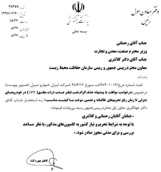 Rysunek 1. List (w języku perskim) do Rezy Rahmaniego, ministra przemysłu, górnictwa i biznesu, oraz Issy Kalantariego, wiceprezesa i szefa departamentu środowiska, od Kazema Chehehgoshy, szefa sztabu starszego wiceprezydenta Iranu, podpisany 11 września 2019 r. W tym oficjalnym liście Chehrehgosha informuje Rahmaniego i Kalantariego o zarządzeniu starszego wiceprezydenta, Eshaqa Jahangiriego, dotyczącym wniosku Iran Khodro Company (IKCO), głównego irańskiego producenta pojazdów, który domagał się zwolnienia z wymogu instalowania DPF (filtrów cząstek stałych) w pojazdach z silnikiem Diesla do czasu zniesienia „opresyjnych sankcji” i zapewnienia produkcji paliwa odpowiedniej jakości. W tym zarządzeniu Jahangiri polecił Rahmaniemu i Kalantariemu ocenić prośbę IKCO „pozytywnie” i przyznać pozwolenie „na jakiś czas”, biorąc pod uwagę „warunki sankcji i zapotrzebowanie kraju na wspomniane ciężarówki (we wniosku)”.