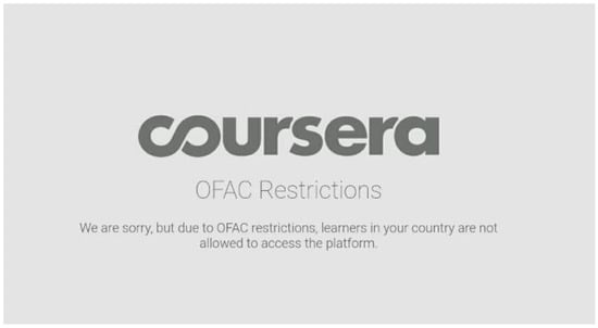 Rysunek 2. Wiadomość otrzymana przez użytkownika z Iranu podczas próby rejestracji na masowy otwarty kurs online (MOOC) „Wprowadzenie do zrównoważonego rozwoju” na platformie edukacyjnej Coursera. Podobnie jak inne popularne platformy edukacyjne, takie jak EdX i Udacity, Coursera uznaje sankcje międzynarodowe i amerykańskie przepisy dotyczące kontroli eksportu za główne bariery w świadczeniu usług edukacyjnych użytkownikom z Iranu.