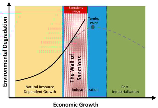 Rysunek 5. Związek między wzrostem gospodarczym a degradacją środowiska w warunkach sankcji [ 1 ]. „Mur sankcji” funkcjonuje jako bariera uniemożliwiająca zmianę składu gospodarki. Efekt sankcji zwiększa zależność gospodarki od zasobów naturalnych i zmienia kształt krzywej EKC (rysunek zaadaptowany z Madani [ 1 ]).