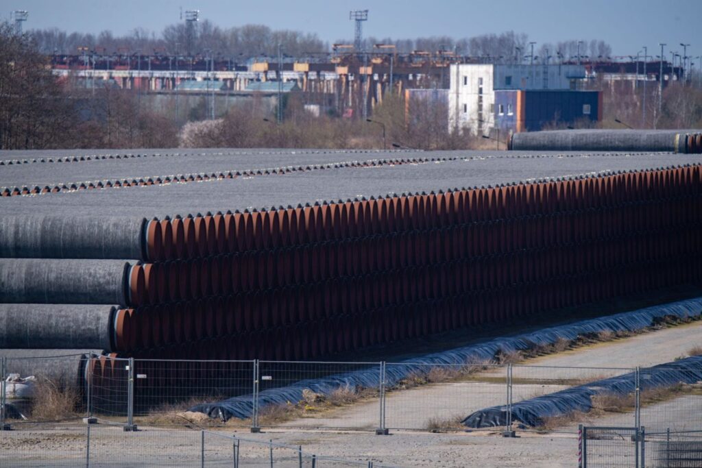 Niewykorzystane rury gazociągu Nord Stream 2 Bałtyk składowane są w porcie Mukran w Lubminie w Niemczech. (Zdjęcie: Stefan Sauer / Alamy)
