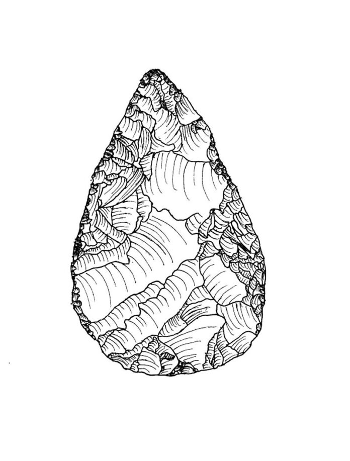 To jest rysunek repliki ręcznego topora Acheulskiego znalezionego w okresie dolnego paleolitu. Narzędzie na tym rysunku jest wykonane z czarnego obsydianu i jest obrabiane z obu stron. CC BY-SA 4.0