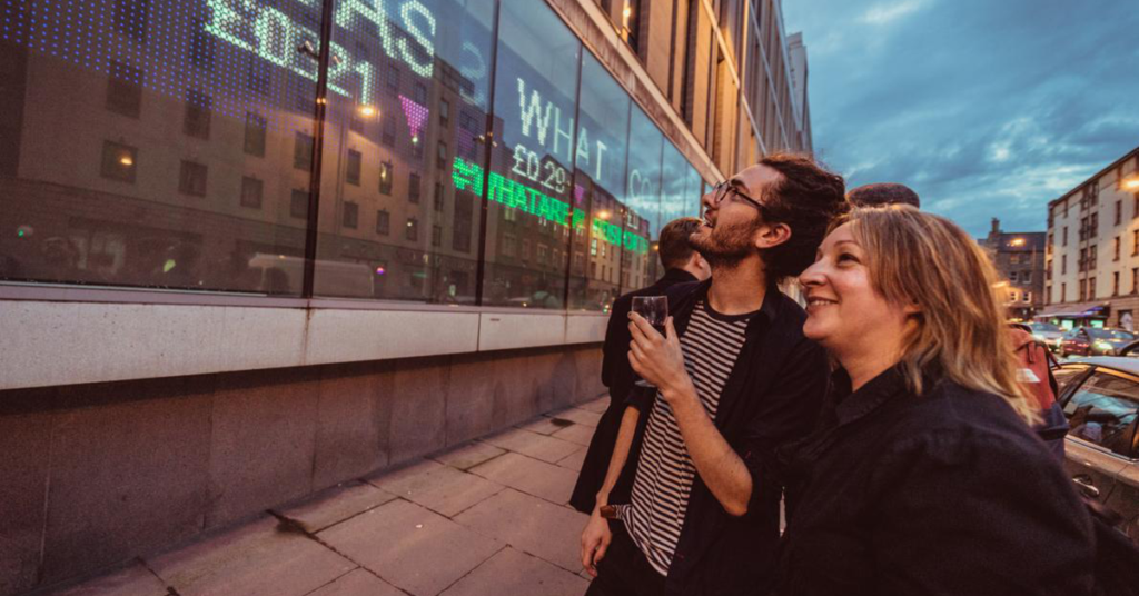 W 2017 roku zaprezentowano go z całym tekstem Nineteen Eighty-Four pokazanym jako giełdowa taśma giełdowa na panelach LED, przy czym ceny słów zmieniały się zgodnie z bieżącymi danymi z Google Ads we współpracy z Ray Interactive w ramach danych festiwalu Fringe w Edynburgu Program spóźniony.