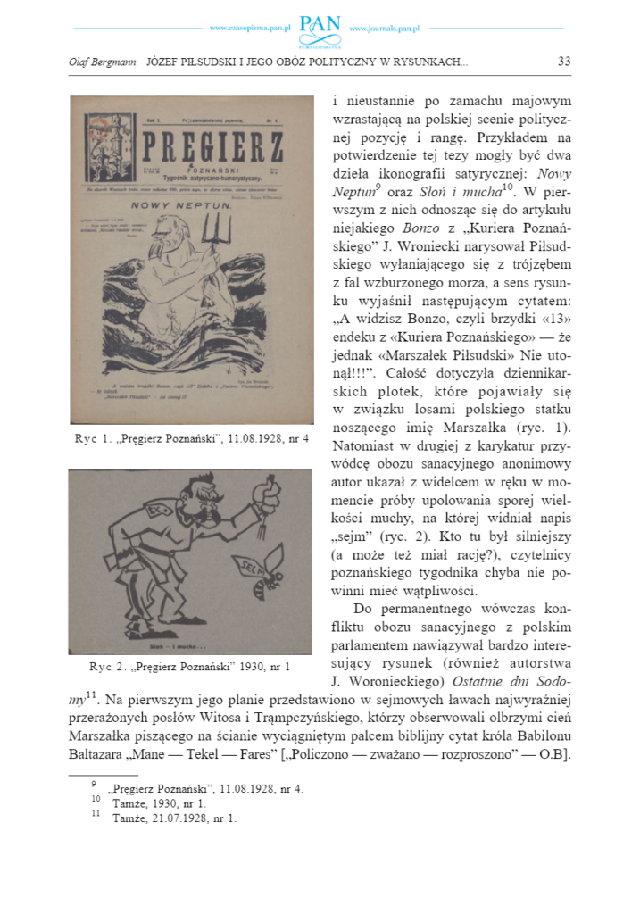 Artykuł Józef Piłsudski i jego obóz polityczny w rysunkach wielkopolskiej prasy satyrycznej, na podstawie dwóch czasopism satyrycznych z okresu II RP ukazujących się w Wielkopolsce, ukazuje obraz marszałka Piłsudskiego i jego najbliższych współpracowników w krzywym zwierciadle karykatury. „Pręgierz Poznański” ukazywał się w latach 1928–1929 i reprezentował poglądy liberalne, traktując bohatera tego artykułu z lekkim odcieniem krytycyzmu. Wydawane pod koniec lat 30. „Pokrzywy” były czasopismem narodowym, więc publikowane w nim wizerunki obozu sanacyjnego były bardzo negatywne.