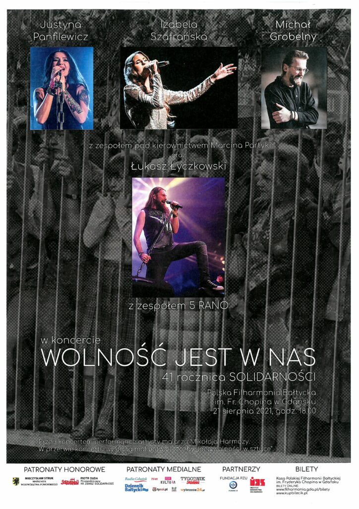 Jak już pisaliśmy, w tym roku nasza Fundacja, przy pomocy pozyskanych partnerów projektu: Fundacji PZU oraz Instytutu Dziedzictwa Solidarności, organizuje ważny koncert rocznicowy „Wolność jest w nas” z okazji 41 rocznicy SOLIDARNOŚCI. Polskiego zrywu społecznego, któremu zawdzięczamy to, że dziś żyjemy w Wolnym Świecie. Dziś postanowiliśmy zaprezentować kolejny plakat promujący ten koncert i naszych wykonawców – wokalistów i muzyków. O artystach, którzy wzbogacą cześć „plastyczną” napiszemy w najbliższym czasie. Koncert odbędzie się za miesiąc w Polskiej Filharmonii im. Fr. Chopina w Gdańsku – 21 sierpnia o godz. 18.00. Poprzedzający koncert performance artysty-malarza Mikołaja Harmozy zacznie się godzinę wcześniej.