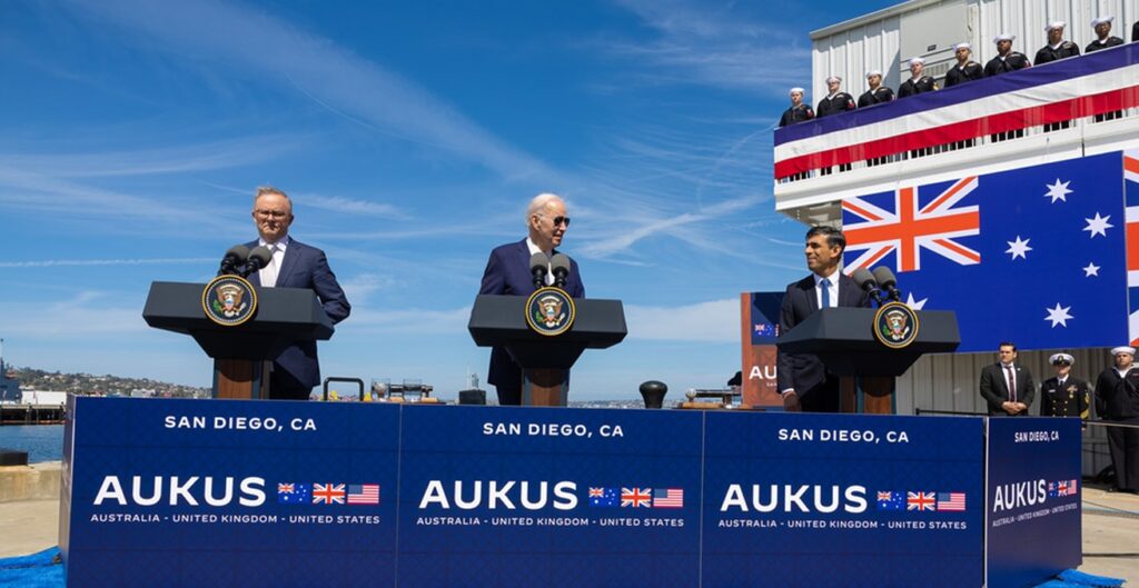 Nic dziwnego, że Chiny postrzegały projekt obronny jako „kierowaną przez USA próbę powstrzymania wschodzącego azjatyckiego supermocarstwa [Chin]” i „część wielkiej strategii USA w ich zintensyfikowanej rywalizacji z Chinami”, a nawet jako „krytyczny krok USA w kierunku zbudowania NATO Azji i Pacyfiku”. Były premier Partii Pracy Paul Keating ostro skrytykował decyzję AUKUS jako druzgocącą, stwierdzając, że „on [Albanese] przykręcił ostatni szekel w długim łańcuchu, który Amerykanie stworzyli, aby powstrzymać Chiny. Jesteśmy teraz częścią polityki powstrzymywania Chin”.