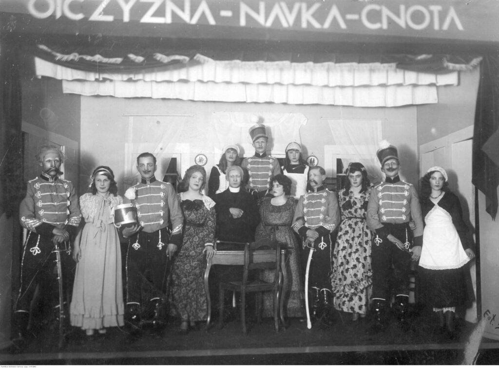 Obraz wyróżniający: Teatr szkolny im. Stanisława Wyspiańskiego podczas występu w „Damach i Huzarach” A. Fredry. Białystok 1935 r. Zbiory NAC on-line