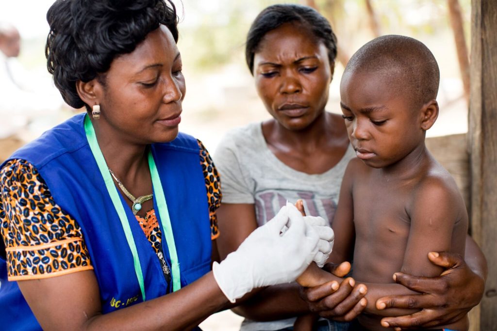 Pracownik służby zdrowia bada dziecko na malarię w obecności jego matki. Kobiety stanowią 65 procent światowej siły roboczej zajmującej się opieką i wykonują ponad 75 procent nieodpłatnej działalności opiekuńczej. Dzięki uprzejmości: Partnerstwo RBM na rzecz zakończenia malarii