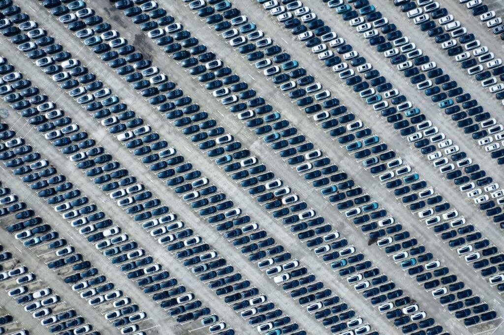 Pojazdy elektryczne w centrum dystrybucyjnym Chang’an Automobile w Chongqing, październik 2023 r. W pierwszych trzech miesiącach 2023 r. chiński eksport pojazdów elektrycznych wzrósł o 122% rok do roku. (Zdjęcie: Alamy)
