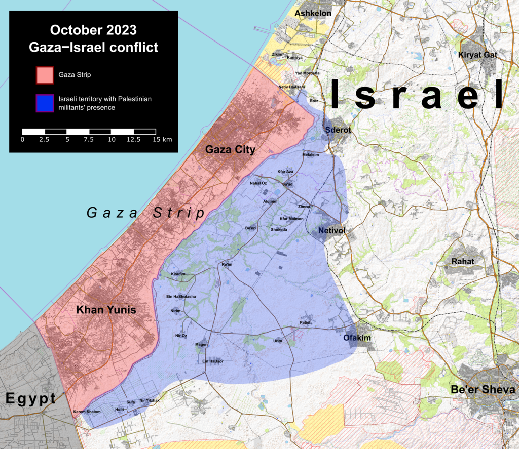 Obraz wyróżniający: Październik 2023 Konflikt Gaza–Izrael. By Ecrusized, influenced by user Rr016. – Own work, NYT, WSJ & Template map. Made using OpenTopoMap data., CC BY-SA 4.0, https://commons.wikimedia.org/w/index.php?curid=138599659