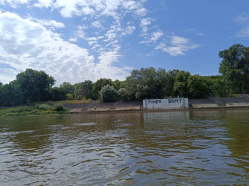 Zastanawiają się Państwo zapewne nad tym, co przedstawia zamieszczone zdjęcie? Dostrzegłem je wypływając z Warszawy, oczywiście postanowiłem się zatrzymać. Obok znajdowała się byle jaka plaża i dwoje młodych ludzi wynajmowało tam plażowe leżaki, co warto też dodać, wynajmującym oferowali do czytania książki, których posiadali dość spory zbiór. Zapytałem ich o to miejsce. Nie znali jego historii, ani – co dziwne – przeznaczenia. A przecież od razu widać, że są to pozostałości po trybunach wioślarskich. Przed wojną, a i jeszcze w latach 70-tych (jako dowiedziałem się później od sympatycznej pani, którą spotkałem w Płocku, a która w tamtych latach studiowała w Warszawie i należała do sekcji wiosłowej w ramach AZS) sporty wodne traktowane były przez władze krajowe i samorządowe poważnie, dostrzegano ich rangę i znaczenie.