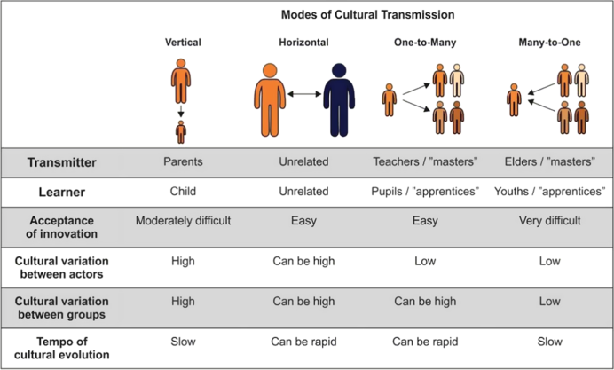 Tabela 1 Różne szerokie kategorie przekazu kulturowego, które powodują towarzyszącą im długoterminową dynamikę zmian kulturowych (Hewlett i Cavalli-Sforza, 1986 )