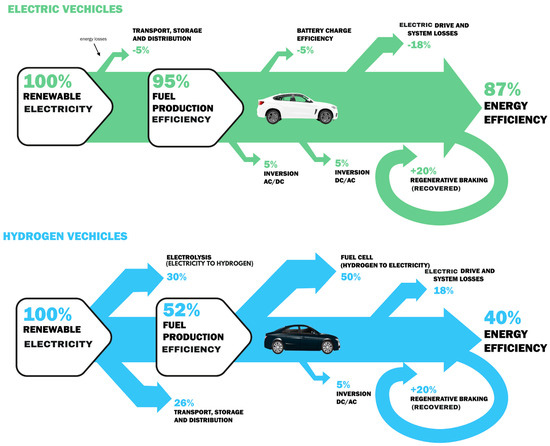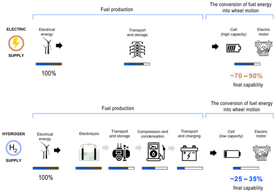 Pojazdy napędzane wodorem oferują istotną przewagę pod względem wydajności i zasięgu. W przeciwieństwie do pojazdów elektrycznych, które zależą od akumulatorów, samochody wodorowe wytwarzają energię elektryczną za pomocą ogniw paliwowych, umożliwiając dłuższe zasięgi bez konieczności częstego ładowania [ 51 , 52 ]. Ta cecha rozwiązuje powszechny problem „lęku o zasięg” związanego z pojazdami elektrycznymi, czyniąc samochody wodorowe realną opcją dla szerszego grona konsumentów [ 53 ]. Wydajność i zwiększony zasięg pojazdów napędzanych wodorem oznaczają znaczący krok naprzód w technologii motoryzacyjnej. W przeciwieństwie do pojazdów elektrycznych, które polegają na magazynowaniu energii w akumulatorach, samochody wodorowe wykorzystują ogniwa paliwowe do wytwarzania energii elektrycznej w procesie znanym jako konwersja elektrochemiczna. To nie tylko zwiększa ogólną wydajność, ale także pozwala na dłuższe zasięgi bez konieczności częstego ładowania [ 54 ].