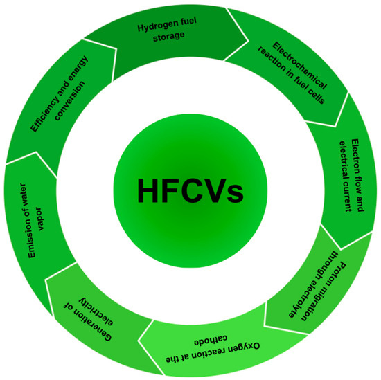 Pojazdy z ogniwami paliwowymi wodorowymi (HFCV) działają na zasadzie wykorzystania reakcji elektrochemicznej z udziałem wodoru i tlenu, która generuje energię elektryczną, która z kolei napędza silnik elektryczny napędzający pojazd [ 67 ]. Zasada działania pojazdów HFCV obejmuje kilka kluczowych etapów ( rysunek 5 ) [ 68 , 69 ].