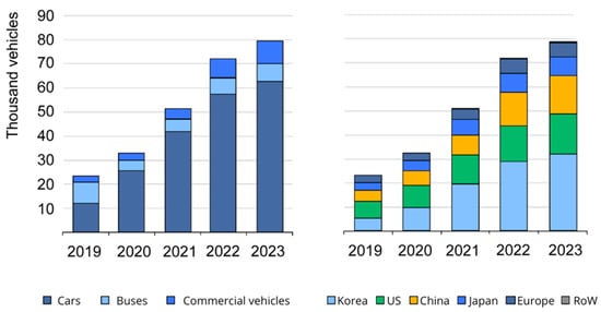 Wydłużony zasięg jest korzystny nie tylko dla transportu osobistego, ale ma również duży potencjał w zastosowaniach komercyjnych i przemysłowych, takich jak floty dostawcze, gdzie ciągła i dłuższa praca ma kluczowe znaczenie [ 55 ]. Pojazdy użytkowe napędzane wodorem mogą sprostać wyzwaniom logistycznym związanym z ich elektrycznymi odpowiednikami, co czyni je wszechstronnym i wydajnym wyborem dla różnych sektorów [ 56 ].