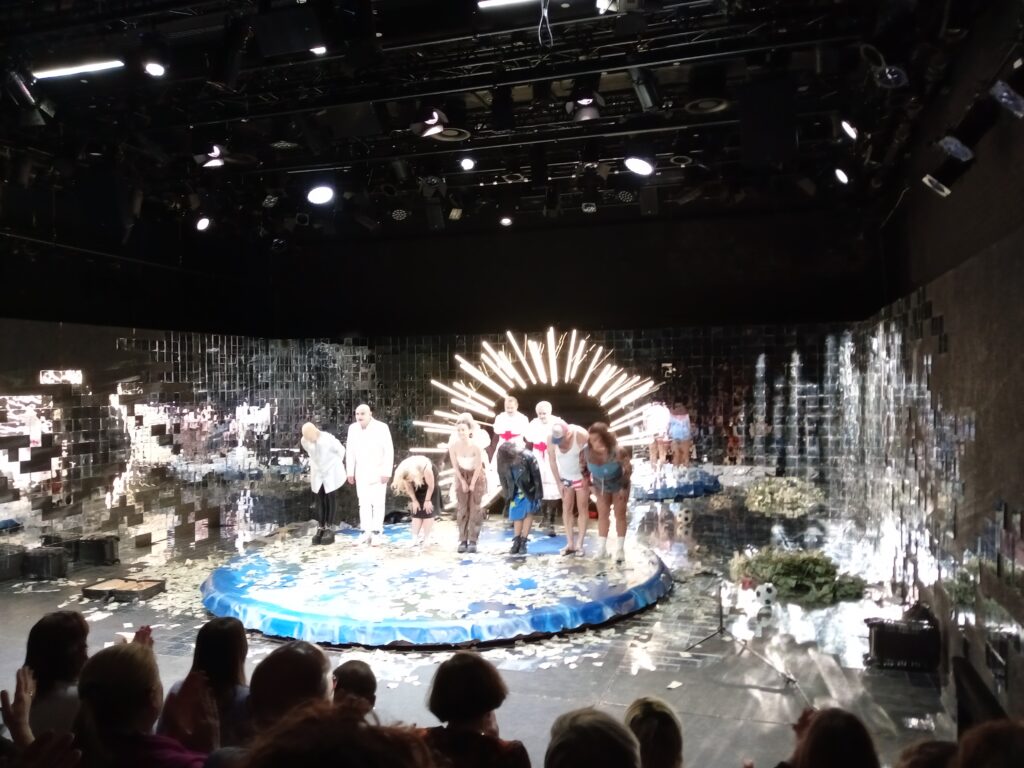 Pierwszym elementem, który zaskakuje po wejściu na widownia jest bardzo efektowna scenografia. Nie ma kurtyny więc scenę widzimy w całości. Ściany przypominają lustra, na środku wiruje mapa świata z leżącą na niej aktorką. Postać jest skulona, wprawdzie ja nie odebrałem jej jako embrionalną, ale być może taki był zamysł twórców. „Mapa” porusza się ruchem obrotowym co sprawia wrażenie, że mamy do czynienia z kręcącą się wokół swojej osi Ziemią.