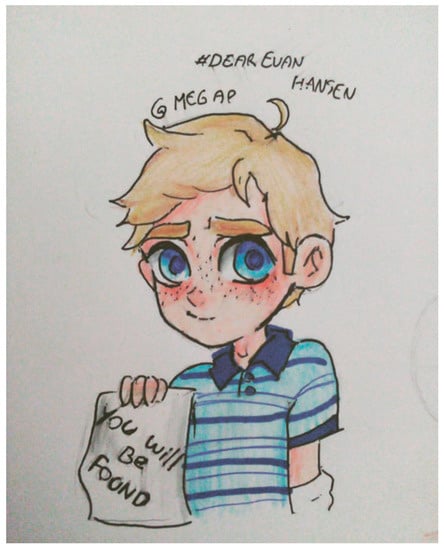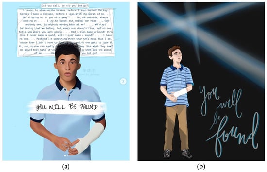 Rysunek 1. ( a ) Grafika cyfrowa przedstawiająca Jordana Fishera jako Evana Hansena z towarzyszeniem popularnego tekstu „You Will Be Found”. Wykorzystano za zgodą @art_by_milanne na Instagramie (2020). ( b ) Kolejna grafika cyfrowa przedstawiająca inną interpretację Evana Hansena z towarzyszeniem popularnego zwrotu. Wykorzystano za zgodą @heylynndraws na Instagramie (2020).