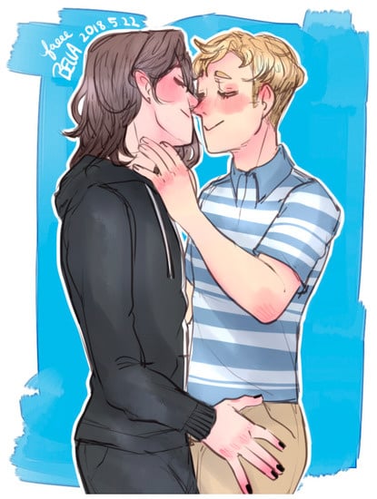 Rysunek 3. Grafika znaleziona pod hashtagiem #treebros, przedstawiająca Evana i Connora w głębokim uścisku, sugerująca potencjalny związek romantyczny między tymi dwoma postaciami, zgodnie z wyobrażeniami fanów. Wykorzystano za zgodą @faeee na Tumblrze (2018).