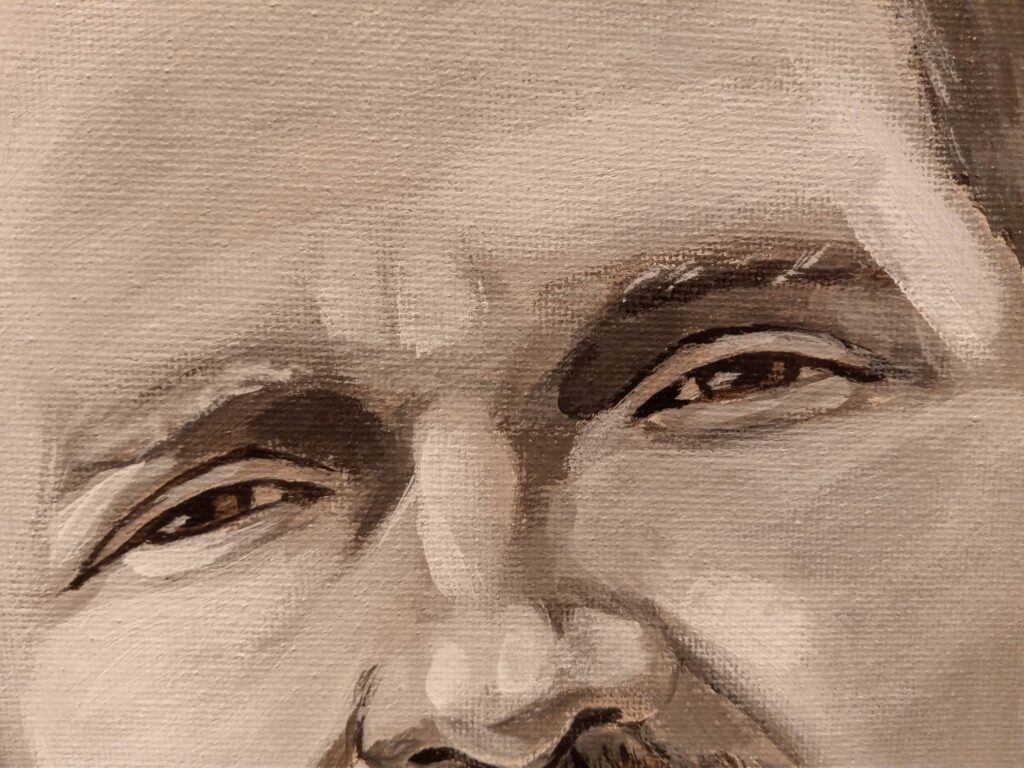Z kolei Bartosz Necel ma nieco drwiący wyraz twarzy. Chyba nie był zbyt zadowolony z pomysłu malowania jego portretu. Przynajmniej tak to wygląda. Pozwalam sobie na taką interpretację, bo pan Bartosz przybył na wernisaż i w rzeczywistości miał bardziej spokojne spojrzenie (i dłuższą brodę).