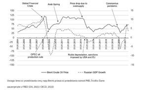 W ciągu ostatnich kilku lat świat doświadczył kilku szoków cenowych, które bezpośrednio wpłynęły na rosyjską gospodarkę. Wykres 1 przedstawia również cenę ropy Brent i zaznacza najważniejsze wydarzenia, które spowodowały oscylacje trendu. Można zauważyć, że okresy recesji w rosyjskiej gospodarce korelują z zaburzeniami cen ropy, a wzrost cen ropy odpowiada wzrostowi rosyjskiego PKB. Wynika z tego, że te dwie zmienne są ze sobą powiązane, a światowe trendy cen ropy w dużym stopniu wpływają na rosyjską gospodarkę.