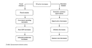 Wpływ cen ropy naftowej na rosyjską gospodarkę można zaobserwować zarówno poprzez kanały fiskalne, jak i monetarne, co zilustrowano na wykresie 3. Z perspektywy fiskalnej wzrost cen ropy naftowej przynosi korzyści rosyjskiej gospodarce poprzez podatki nakładane na eksport zasobów energetycznych. To generuje nadwyżkę fiskalną, umożliwiającą rządowi zwiększenie wydatków i stymulowanie wzrostu realnego PKB (Benedictow i in., 2013, Ju i in., 2016, Taghizadeh-Hesary i in., 2019). Efekt ten jest szczególnie wyraźny w większych gospodarkach o znacznym eksporcie ropy naftowej, takich jak Rosja, Zjednoczone Emiraty Arabskie i Arabia Saudyjska. Badanie przeprowadzone przez Ito (2012) wykazało, że PKB i inflacja Federacji Rosyjskiej były podatne na zmiany cen ropy naftowej na świecie w latach 1995-2009. Ponadto Alekhina i Yoshino (2019) stwierdzili znaczący wpływ zmian cen krajowych producentów ropy i gazu na zagregowaną podaż i popyt w Rosji w latach 2000-2016. Powszechnie oczekuje się, że gdy ceny ropy rosną, gospodarki bogate w zasoby naturalne zwykle odnoszą znaczne korzyści w krótkim okresie.