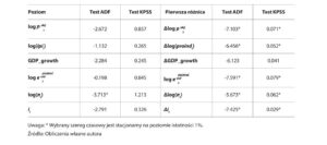W tym celu zastosowano test Augmented Dickey-Fuller (ADF) oraz testy pierwiastka jednostkowego Kwiatkowskiego-Phillipsa-Schmidta-Shina (KPSS). Aby ułatwić analizę, zmienne (z wyjątkiem stopy procentowej) zostały przekształcone do postaci logarytmicznej. Test ADF bada obecność pierwiastka jednostkowego w szeregu czasowym, co wskazuje na niestacjonarność. Test ADF ma jednak stosunkowo niską moc odrzucenia hipotezy zerowej. Dlatego uzupełniliśmy naszą analizę, stosując test KPSS, który zapewnia dalsze potwierdzenie. Hipoteza zerowa testu ADF zakłada istnienie pierwiastka jednostkowego, co oznacza niestacjonarność szeregu czasowego. W konsekwencji, jeśli test ADF nie odrzuci hipotezy zerowej, nie zaleca się wykorzystywania zmiennej do analizy empirycznej. Z drugiej strony, test KPSS zakłada brak pierwiastka jednostkowego, wskazując na stacjonarność szeregu czasowego. W związku z tym, stosując oba testy, uzyskujemy bardziej kompleksową ocenę właściwości stacjonarności zmiennych. Testy zostały na zmiennych zarówno na ich oryginalnych poziomach, jak i na ich pierwszych różnicach, reprezentujących zmiany z jednego okresu do następnego. Pozwala nam to zbadać transformację wymaganą do osiągnięcia stacjonarności i zidentyfikować wszelkie trendy lub wzorce w danych. Wyniki testów przedstawiono w tabeli 2. Wyniki oznaczone gwiazdką są stacjonarne na poziomie istotności 1%. Warto zauważyć, że z wyjątkiem zmiennej inflacji, wszystkie szeregi danych są niestacjonarne, a zatem nie nadają się do analizy. Należy zauważyć, że test ADF ma stosunkowo wysoki poziom błędu typu I, co oznacza, że odrzucenie hipotezy zerowej może być nieprawidłowe. Taka sytuacja może mieć miejsce w przypadku wyników dla stopy inflacji, która według testu ADF jest stacjonarna. Sprawdziliśmy wyniki testu KPSS, aby zweryfikować ten wynik, który wskazuje, że szereg czasowy stopy inflacji jest niestacjonarny tylko w pierwszej różnicy. W wyniku testów ADF i KPSS używamy pierwszych różnic logarytmów zmiennych, ponieważ udowodniono, że są one stacjonarnymi szeregami czasowymi, a zatem nie może na nie wpływać losowość. Dzięki tej rygorystycznej analizie stacjonarności i pierwiastka jednostkowego zapewniamy ważność i solidność naszej późniejszej analizy empirycznej, umożliwiając dokładniejsze zbadanie relacji i dynamiki między badanymi zmiennymi.