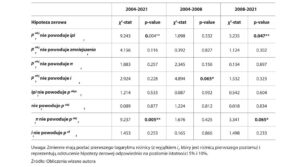 Test przyczynowości Grangera ocenia przyczynowość kierunkową między cenami ropy Brent a kluczowymi wskaźnikami makroekonomicznymi, w szczególności wskaźnikiem produkcji przemysłowej i wskaźnikiem cen konsumpcyjnych, w całym zbiorze danych i dwóch odrębnych podokresach: 2004- 2008 i 2008-2021. Test pozwala zbadać, czy dany szereg czasowy jest w stanie prognozować inny, co kwestionowane w hipotezie zerowej. Jeśli okaże się, że jedna zmienna (Y) jest „przyczyną Grangera” drugiej zmiennej (X), oznacza to, że przeszłe wartości Y zawierają informacje, które mogą być przydatne w szacowaniu wartości X. Statystyczna istotność wyników analizy opiera się na wartości p-value. Można odrzucić hipotezę zerową, jeśli wartość prawdopodobieństwa jest mniejsza niż 5% poziomu istotności.