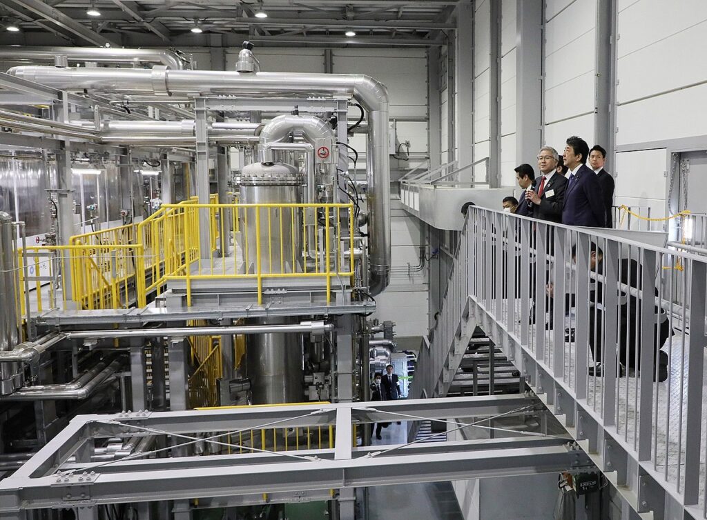 Shinzo Abe odwiedza obiekt FH2R w marcu 2020 r.