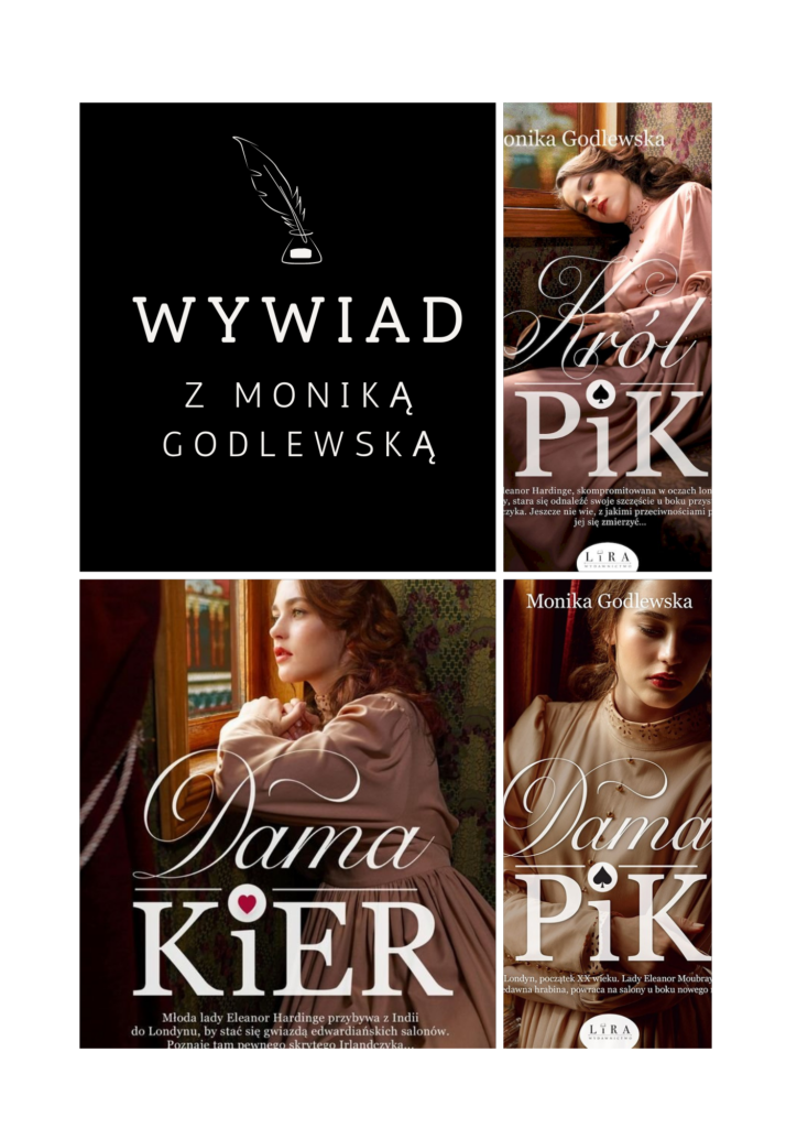 Monika Godlewska: Jako pierwsze musiały być historia oraz pisanie, myślę, że nawet w tym samym czasie. Pamiętam, że od dzieciństwa uwielbiałam czytać książki, których akcja rozgrywała się w dawnych czasach. „Małgosia contra Małgosia”; czy „Godzina Pąsowej Róży” to były jedne z moich ukochanych książek! „Godzina Pąsowej Róży” sprawiła, że postanowiłam napisać kiedyś powieść rozgrywającą się w XIX wieku. I prawie mi się to udało! Co prawda „Dama Kier” startuje w roku 1903, ale to naprawdę niewielka różnica. Wstawki z języka francuskiego oraz języka irlandzkiego wydawały mi się istotne, ponieważ wzmagają klimat. Główna bohaterka „Damy Kier” Nora Hardinge, jest w połowie Francuzką, poza tym jej nieznośny, nieco kapryśny charakterek w sam raz pasuje do francuszczyzny. Łatwo wyobrazić sobie tę próżną, choć bardzo uroczą damę, cedzącą słówka i co rusz wtrącającą coś po francusku. Z kolei irlandzki jest dla mnie językiem kompletnie nieznanym, niemniej jednak wyszukiwanie odpowiednich fraz było dla mnie ciekawym doświadczeniem. Myślę, że bez pisania tej książki raczej nie sięgnęłabym akurat do tego języka.